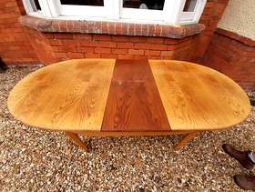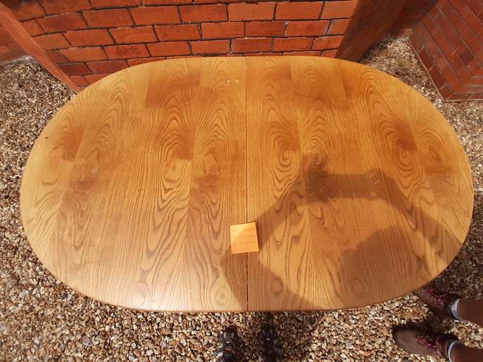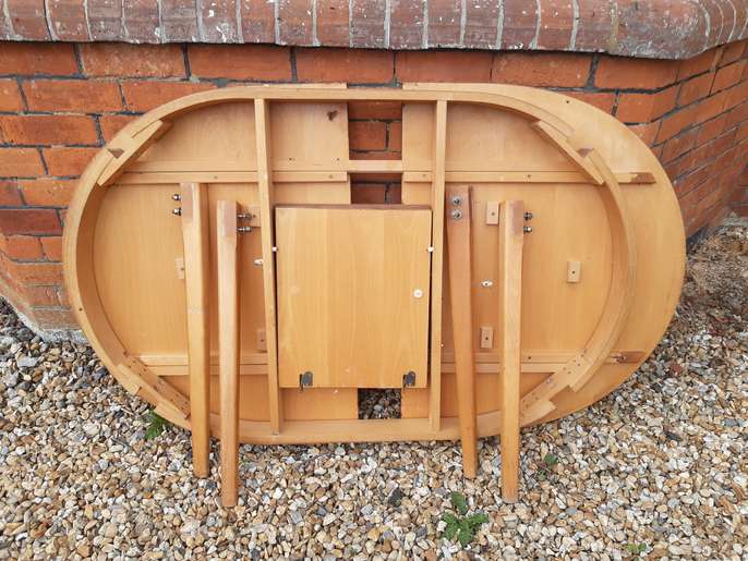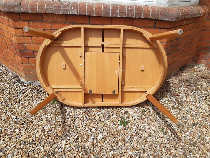 Pine wooden dining table 4ft 8ins long x 2ft 11ins wide will easily seat 6 adults and when extended to 6ft it will easily seat 8 adults. The legs can be removed for transport and storage, a useful feature if the table is required for entertaining purposes, as they are bolted into place when the table is in use. The table has been mostly used closed, which is why the extendable section is a darker colour. There is some wear and tear of the table top, which can easily be covered by a tablecloth, hence the price. The table could also be painted or sanded and re-varnished.