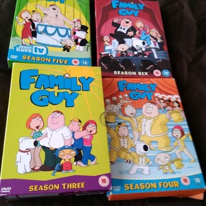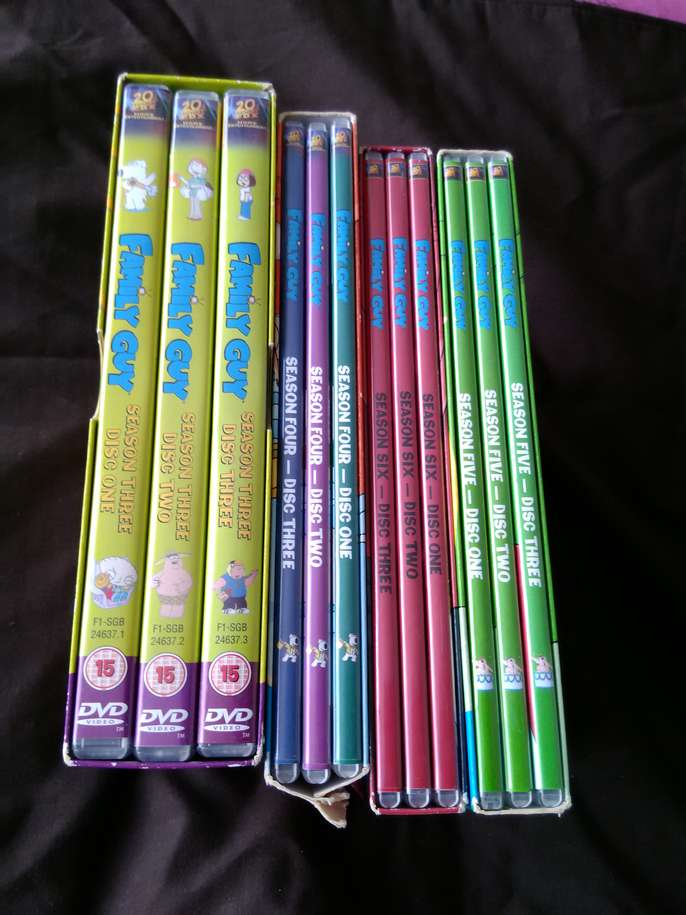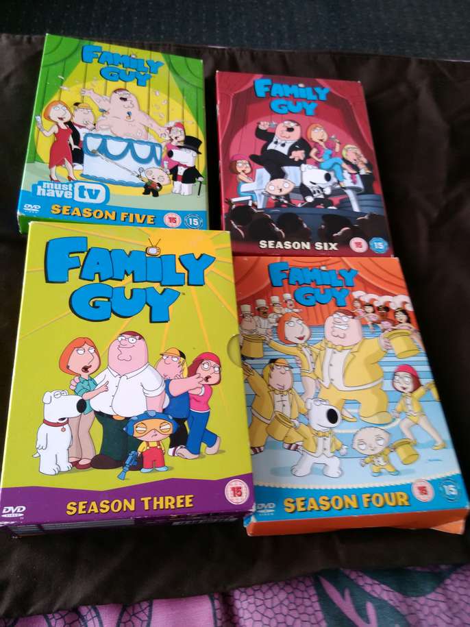 Family guy DVDs This item is in Stevenage GB All the details Four box sets season 3,4,5,6 twelve DVDs in total. Collection only Price £3.00 Time Remaining This listing has finished Category DVDs & Movies Post Message