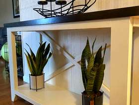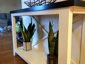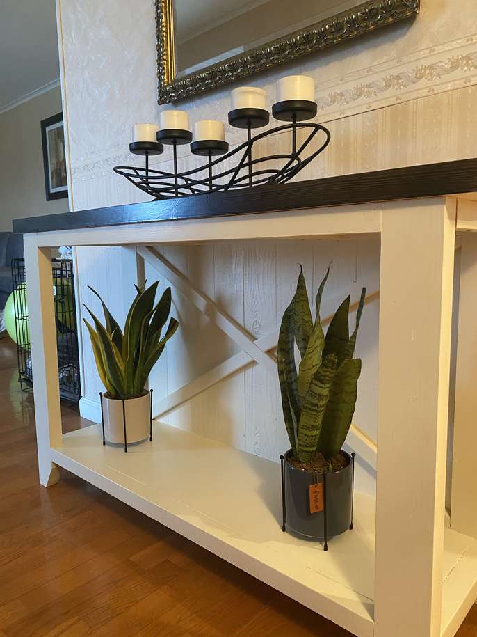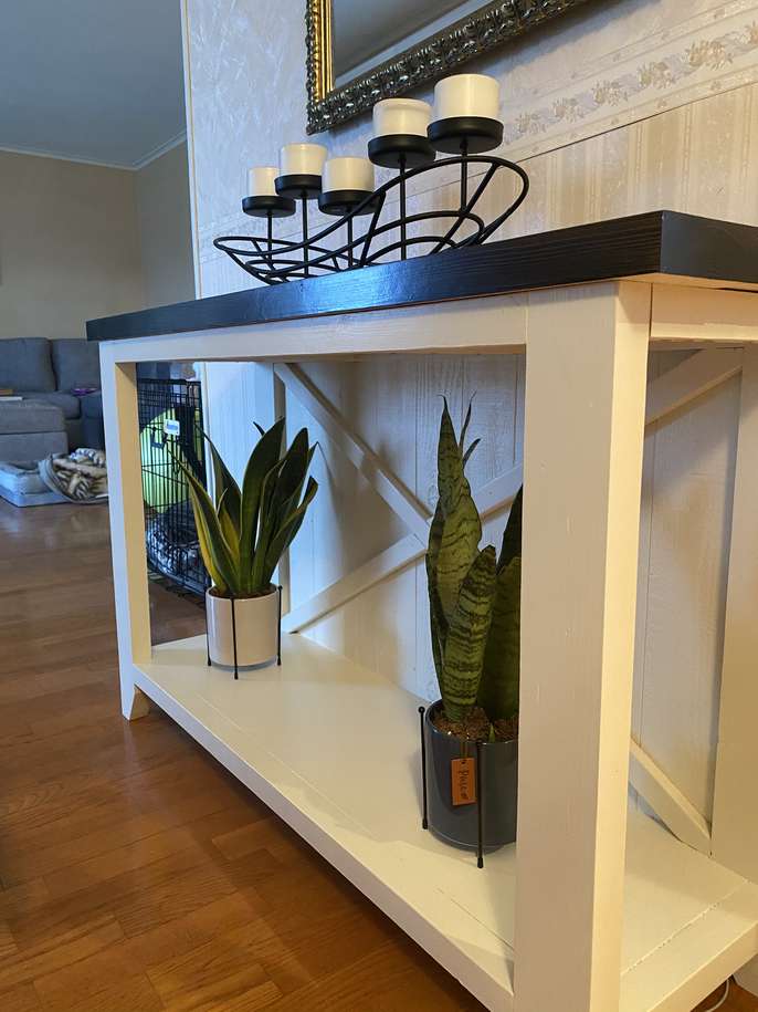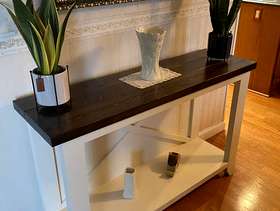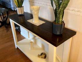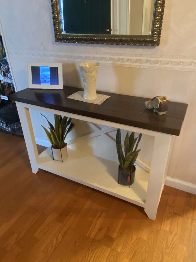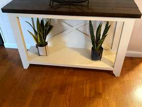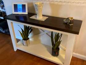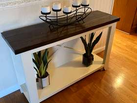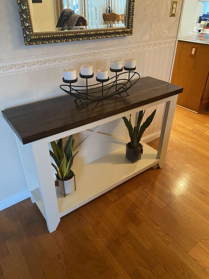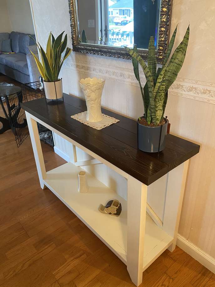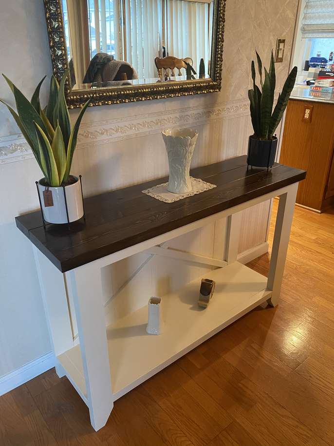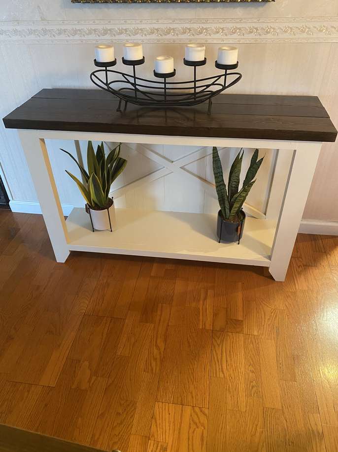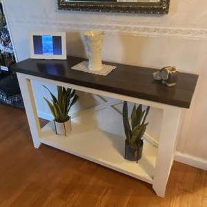 Hand Crafted Farmhouse Style Entry Way Table. The body is painted in an Antique White Satin finish with a Jacobean stained top with a semi-gloss polyurethane finish. It measures 48” long, 14 1/2” wide, and 30” high Can be custom made to your measurements.