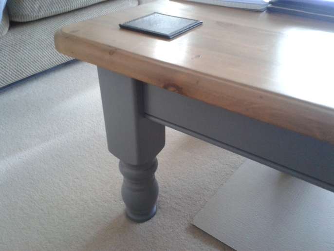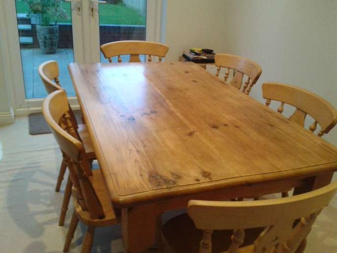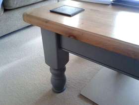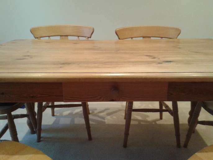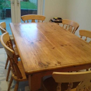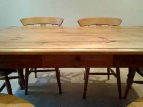 Farmhouse table 5ft (153cm) X 3 ft (92cm) ,Height 77cm and 6 matching chairs. Small storage drawer on one side ideal for table matts and the legs can be detached. Can also be painted as I have with my coffee table(see photo).