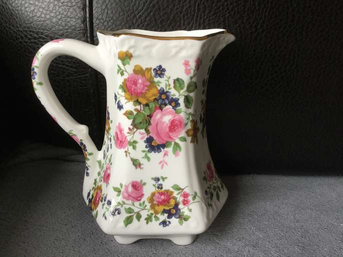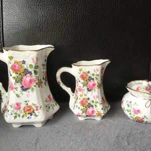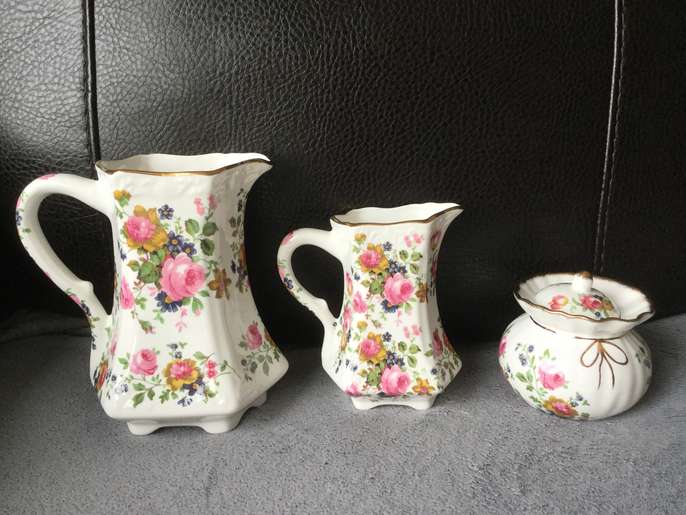 Beautiful matching set of two jugs and one trinket pot made by Fenton China Company in English Bone China. English Rose pattern. Good condition