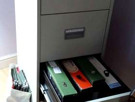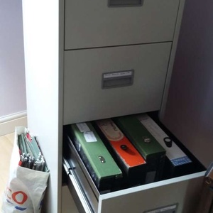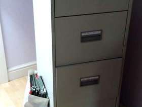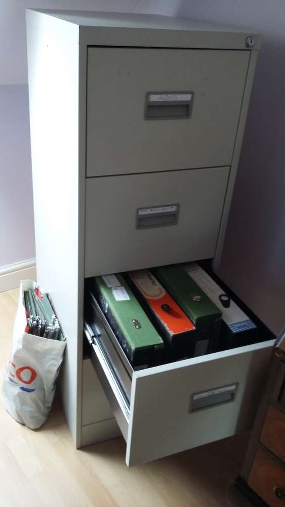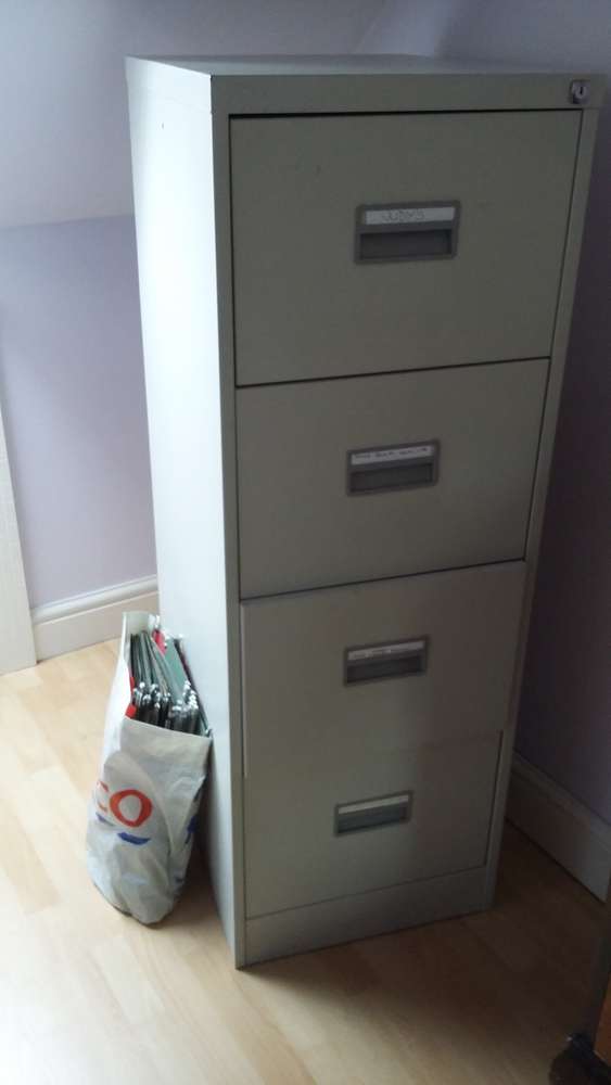 Filing cabinet. Sturdy steel in grey. 4 smooth running drawers with 37 hanging wallets to fit inside drawers. height 133 cms, Width 46 cms. Depth 62 cms. Fair condition.