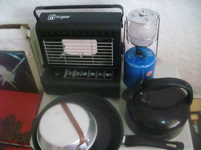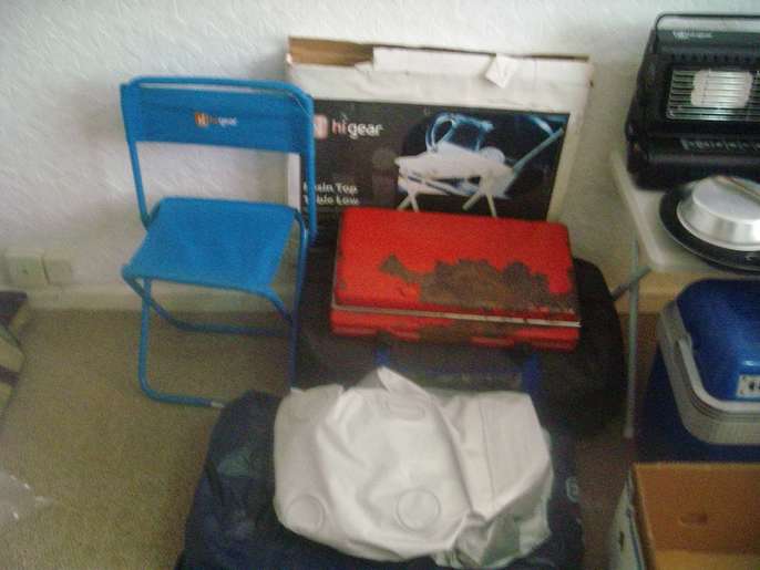 I have a five berth tent never used, there is also a cool box with 12/24 volt connector, gas heater, lantern, two air beds with electric pump, utensils, plates, kettle, frying pan, chair, table, twin burner cooker this is the only item which is used the rest has been stored in my loft for seven years.