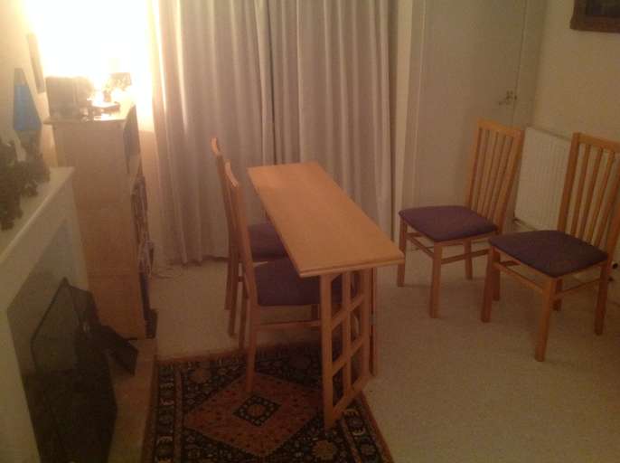 A Dining Table, with four chairs. With two small storage drawers, folds down for easy storage