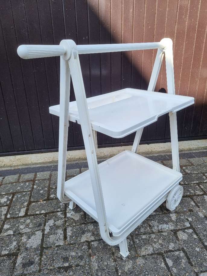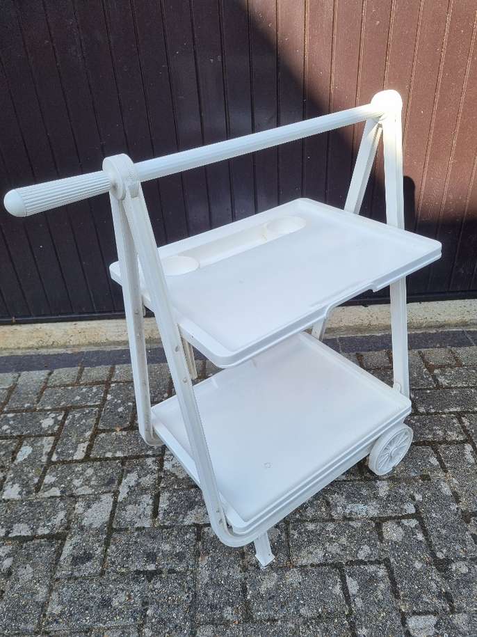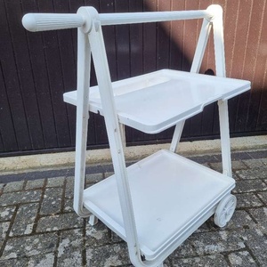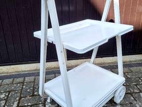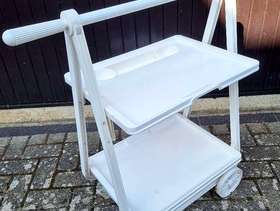 Garden or indoor serving trolley with wheels, white and in good condition. Foldable for easy storage.