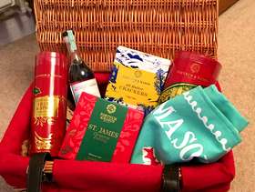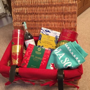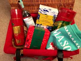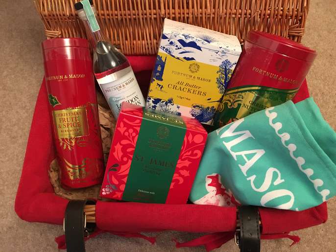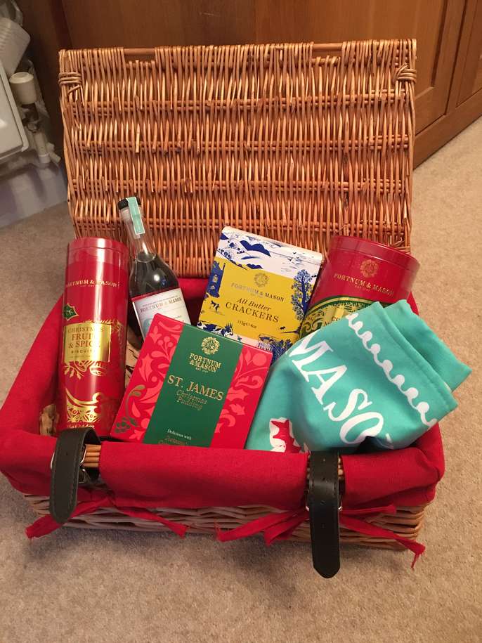 Fortnum & Mason Food Items in a Hamper THE HAMPER (BASKET) IS NOT FROM FORTNUM & MASON All the contents are from Fortnum and Mason Includes Biscuits Tea Towel Crackers Drink Collection from Camberley area