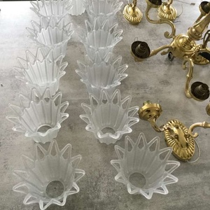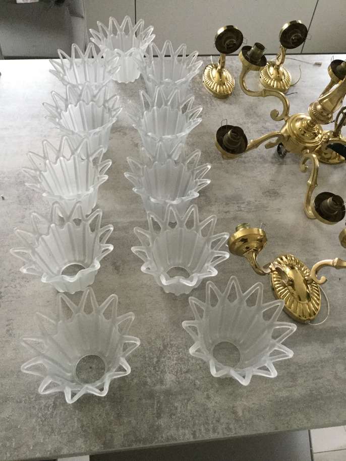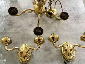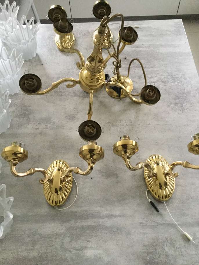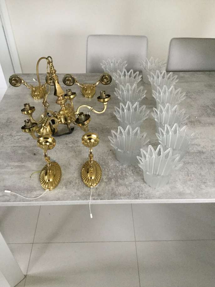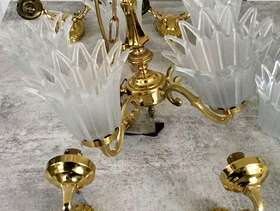Franklite Central Brass 5 arm ceiling light with frosted glass shades together with 2 double and 2 single matching wall lights. In good condition