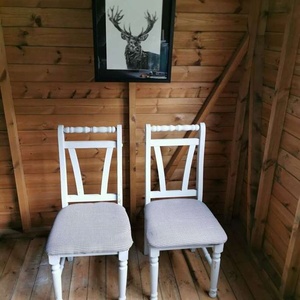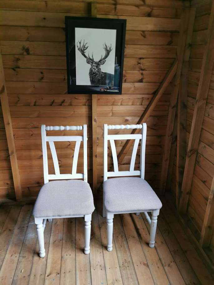 Upcycled shabby chic white farmhouse pine chairs. Refinished in Vintro self sealing paint. There are 4 in total, price is per chair. Collection is from Liss. We also take commissions for furniture and craft items, please message me with any inquiries you may have! :) If you would like any more information, please visit my FB Page: @SunnyStyle.