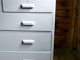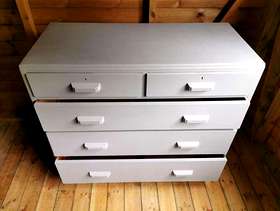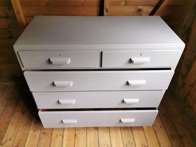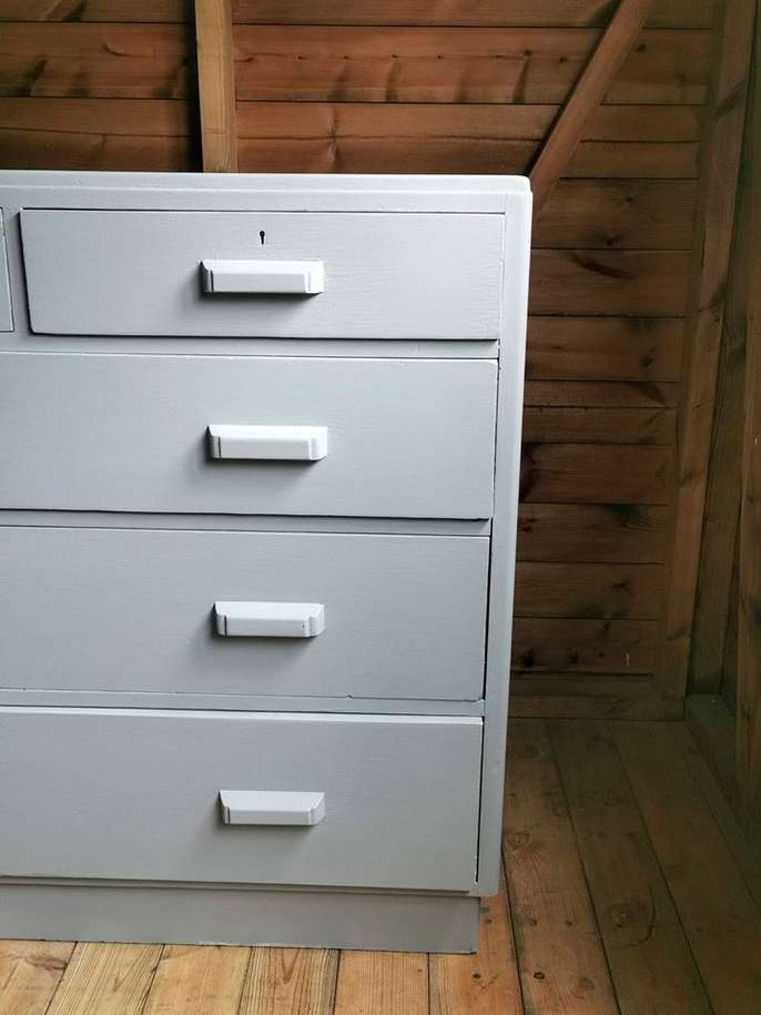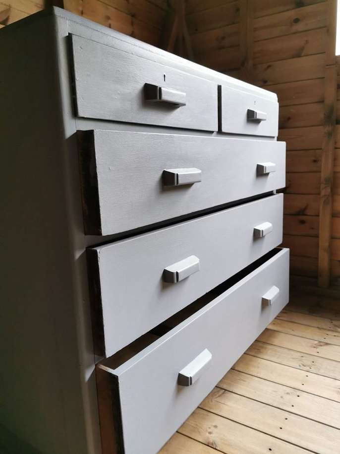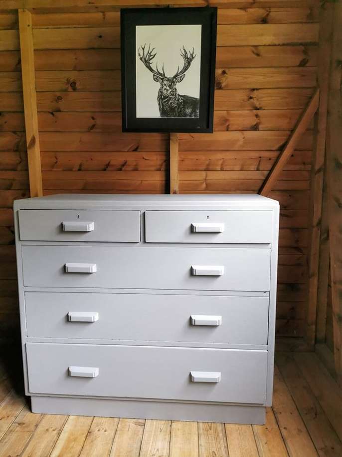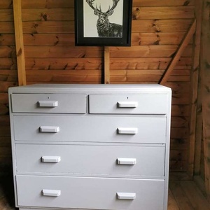 Absolutely solid dovetailed chest of drawers. First made in 1951 by R.Wilkinson London. Hand painted with dove grey chalk paint and sealed. This is a strong piece of furniture that will suit any interior. There may be a few minor discrepancies, as listed above, this is not a new piece of furniture as it has been upcycled and was used in the Army Barracks. I have done my best to remove all of them that I can find. Measurements are: 41.5 inches wide x 19 inches deep x 37.5 inches high. This will definitely need 2 people to lift this, due to the weight of it. Collection from Liss. Nationwide delivery can be arranged. Or I can deliver locally! If you would like any more information, please visit my FB Page: @SunnyStyle.