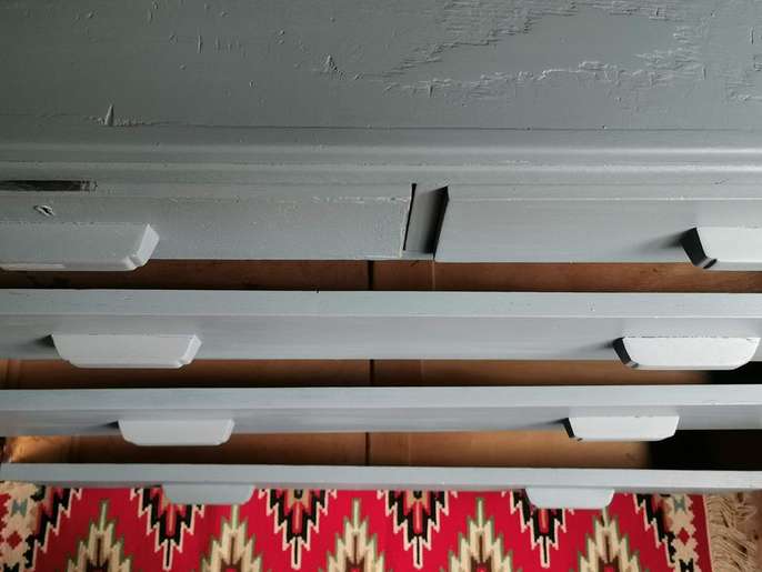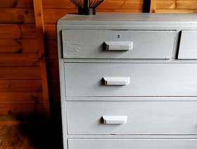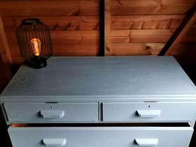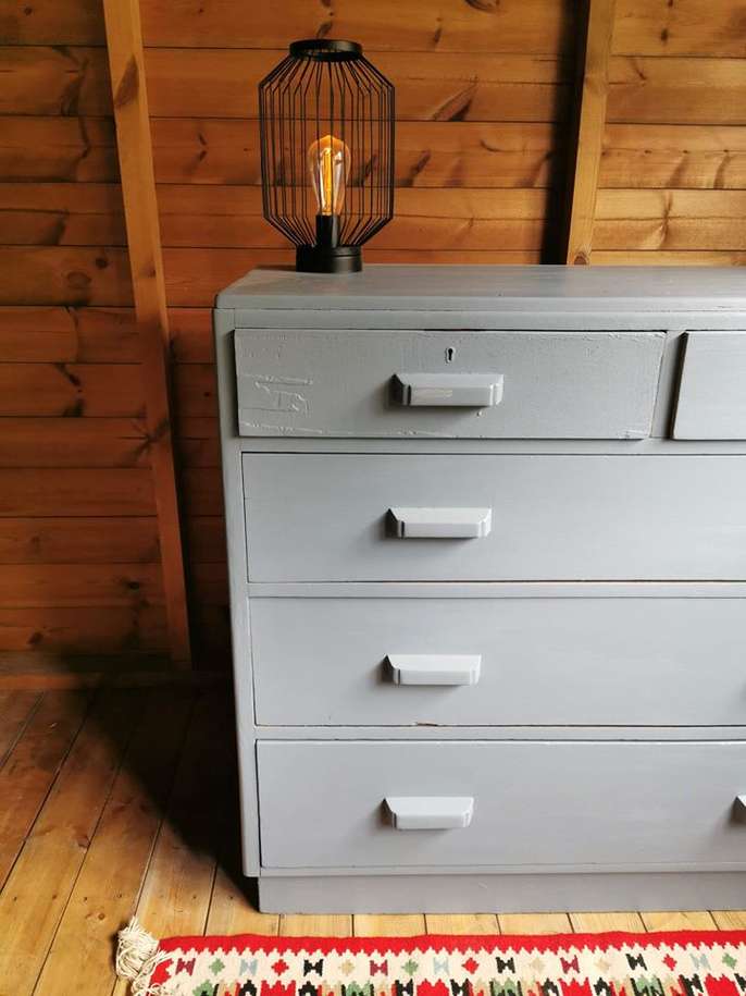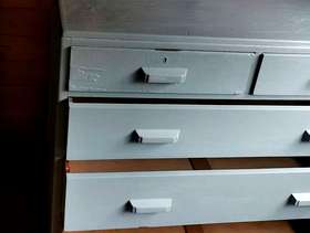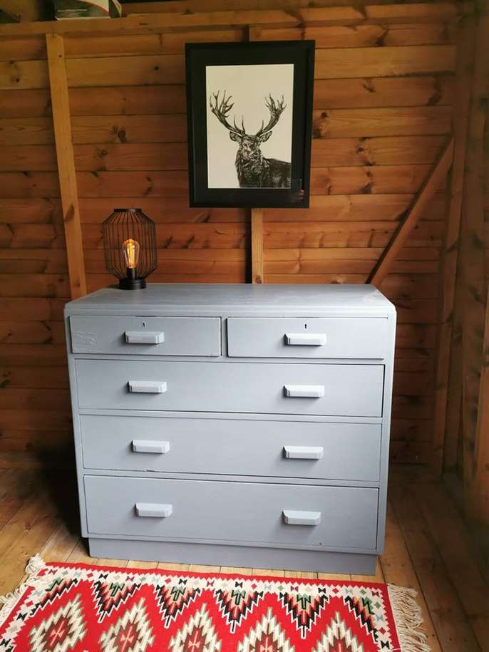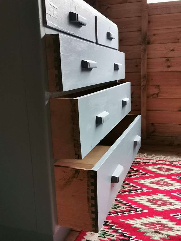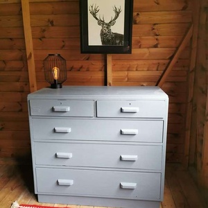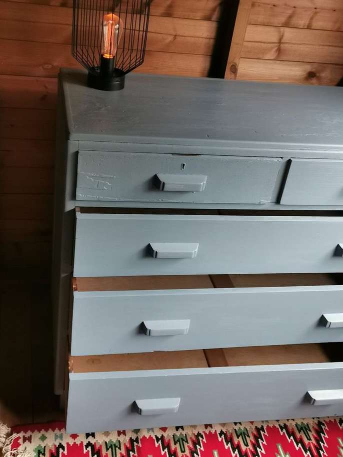 Absolutely solid dovetailed chest of drawers. First made in 1951 by R.Wilkinson London. Hand painted with Cincinnati blue chalk paint and sealed. This is a strong piece of furniture that will suit any interior. There may be a few minor discrepancies, as listed above, this is not a new piece of furniture as it has been upcycled and was used in the Army Barracks. I have done my best to remove all of them that I can find. Measurements are: 41.5 inches wide x 19 inches deep x 37.5 inches high. This will definitely need 2 people to lift this, due to the weight of it. Collection from Liss or I can deliver locally! If you would like any more information, please visit my FB Page: @SunnyStyle.