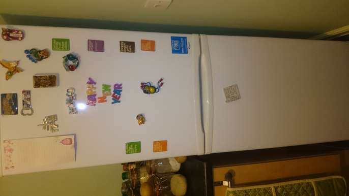 Candy white fridge freezer. One freezer door damaged. 18months can only be picked up on 29th March.