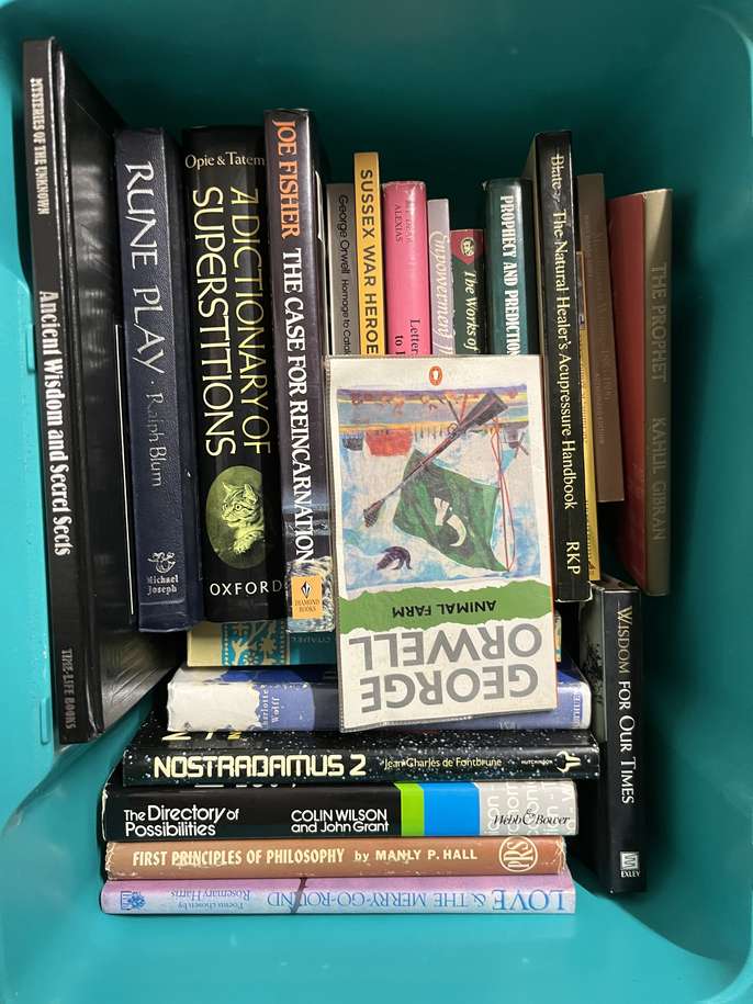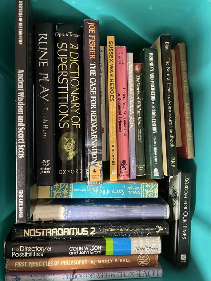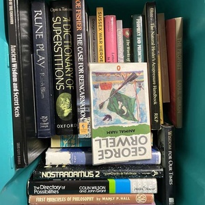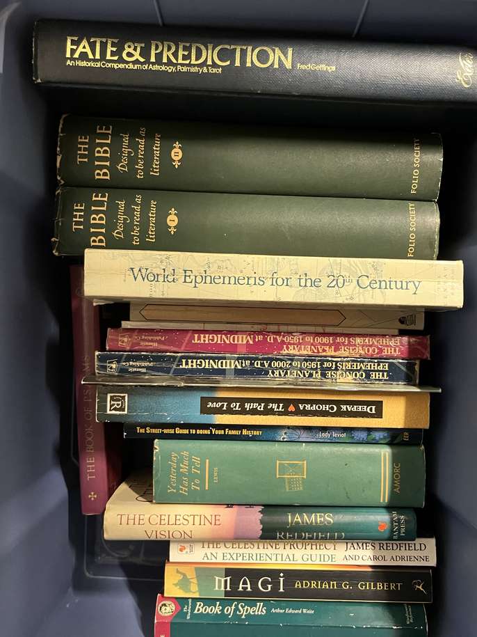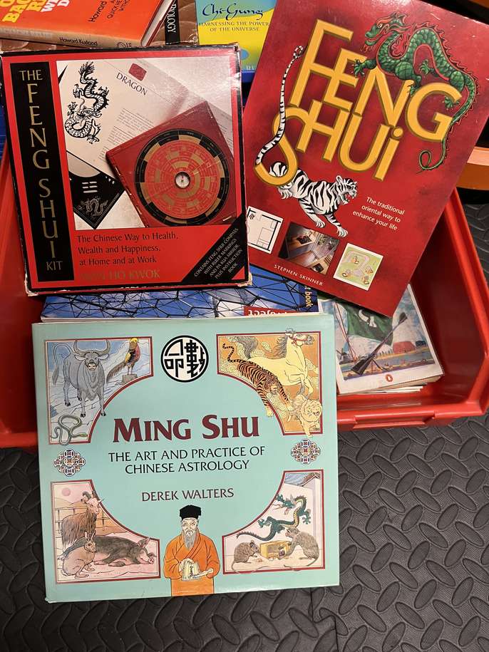 In excess of a 100 books, all read andstudied. - Astrology - Healing techniques & practices, oriental, shiatsu, herbal etc. Feng shu Ming shu, Esoteric practices & many more.