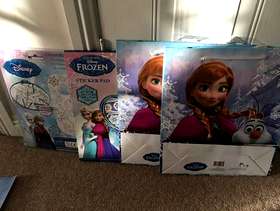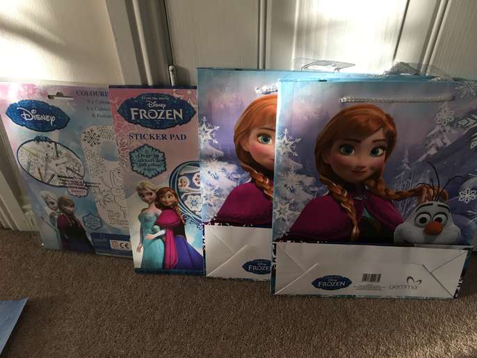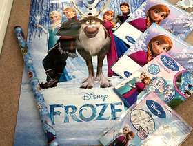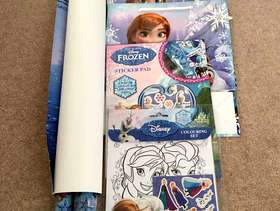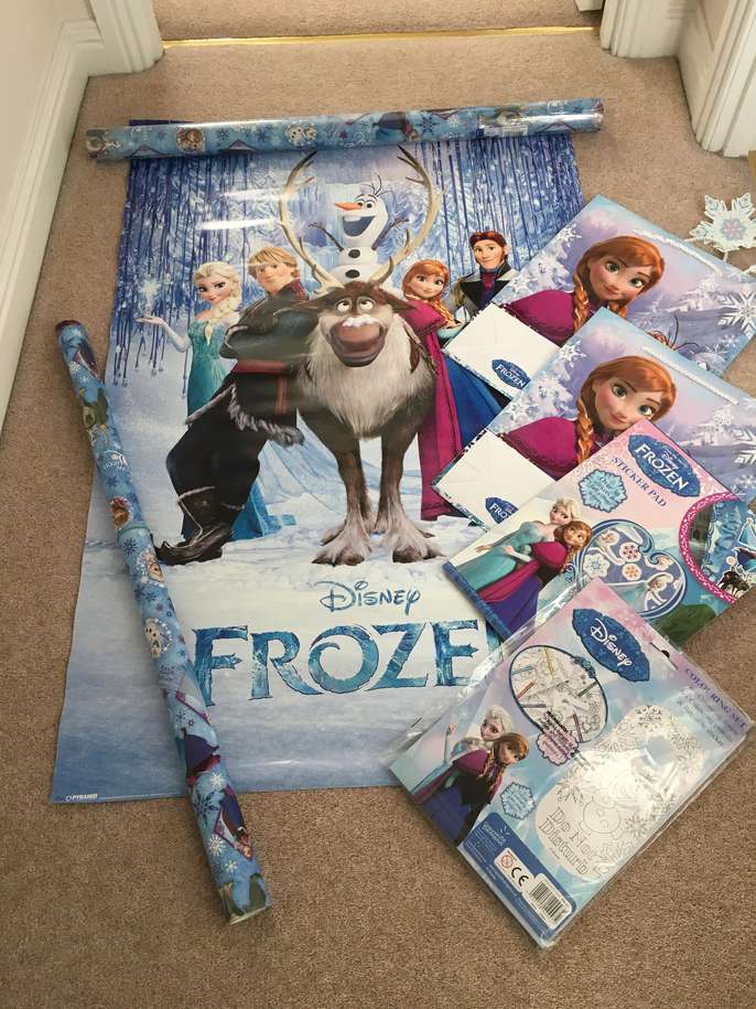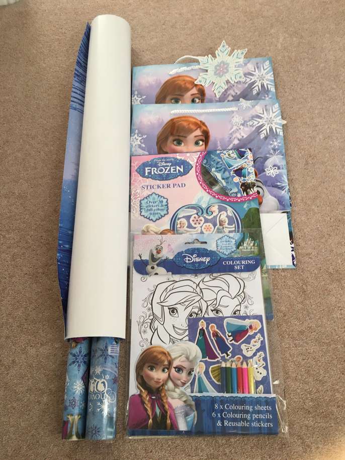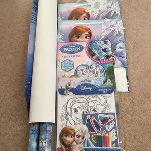 Bundle of Frozen items Poster very slight tear at the top (repairable) 1.5 Rolls of wrapping paper 2 x Carrier Bags with tags Colouring Set Sticker Pad
