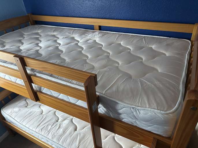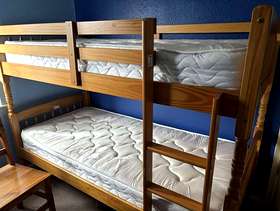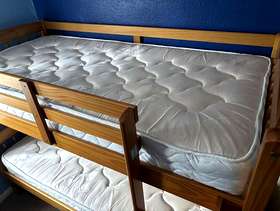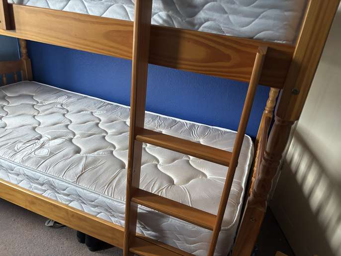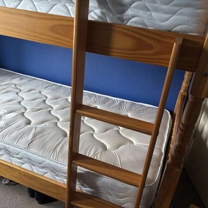 Full size single pine bunk beds. Also included mattresses, two quilts and two pillows. Buyer to collect from Cudworth, Barnsley
