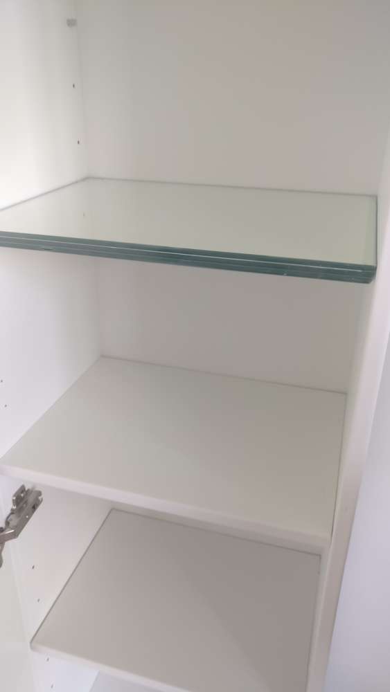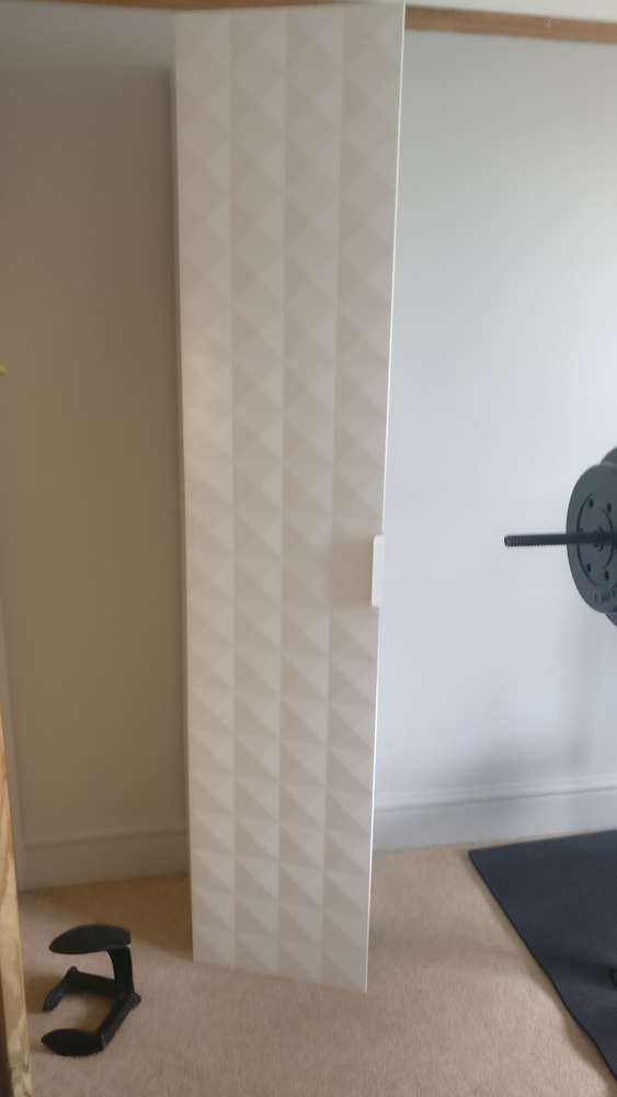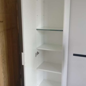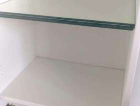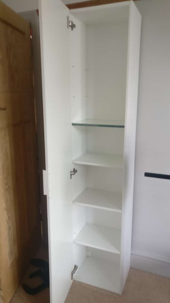 Tall cupboard, white from IKEA, never used and now not suitable. Height 192cm, width 40cm, depth 32cm. I bought from a second hand furniture shop so the legs are missing, you may want to buy small cheap legs from B & Q. Has three solid white shelves and three glass (wrapped in protective plastic) I paid £60 but want get rid, hence the price. Collection only.