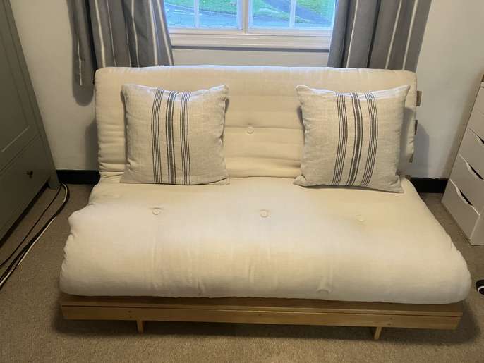 Brand: The Futon Company Oak framed Cream Cotton Cover Double seater/ Sleeper size double Very good condition - hardly used Depth: 85cm Width when flat and upright: 135cm Height when upright: 70cm Seat depth when upright: 60cm No Assembly required