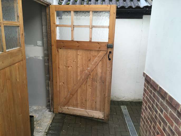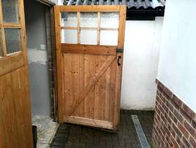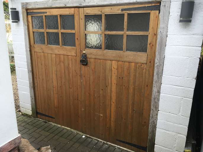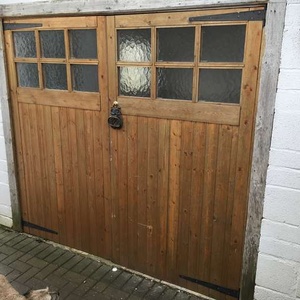 Pair of wooden garage doors with locks, hinges and handles. Each door measures 107cm by 197cm
