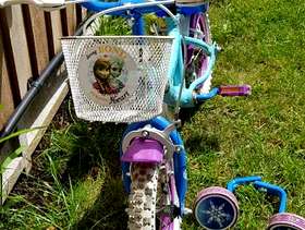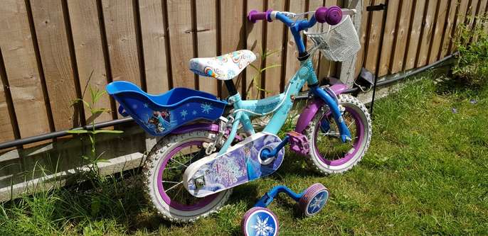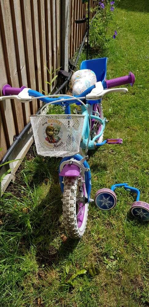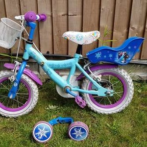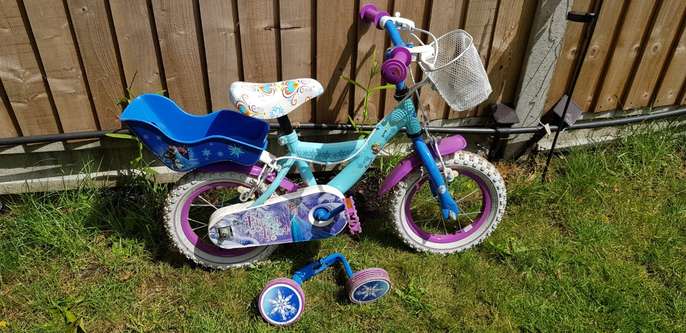 Girls 'Frozen' Bike with Stabilizers Great condition, comes with detachable stabilizers. Also with basket at the front and a 'seat' at the back to put dolls & teddys in when your little one goes for a ride Adjustable seat and handle bars Great for ages 3+ Collection Only - Please see my other items for girls clothes, books, puzzles, toys & games