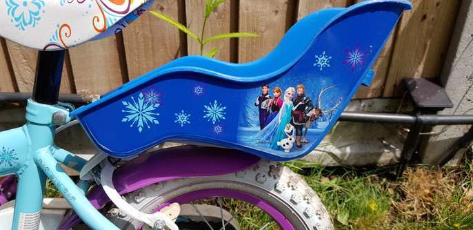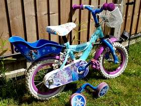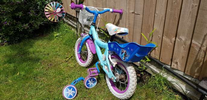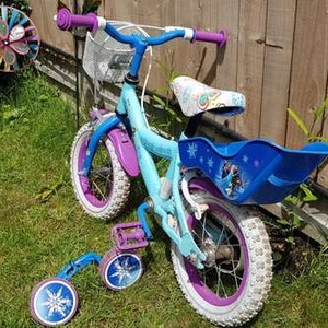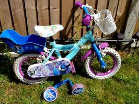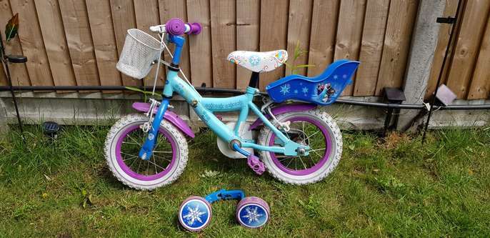 Girls 'Frozen' Bike with Stabilizers Great condition, comes with detachable stabilizers. Also with basket at the front and a 'seat' at the back to put dolls & teddys in when your little one goes for a ride Adjustable seat and handle bars Great for ages 3+ Collection Only - Please see my other items for girls clothes, books, puzzles, toys & games