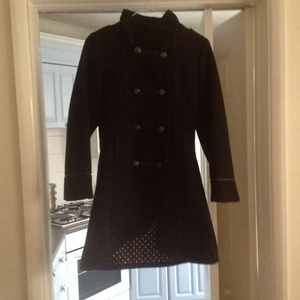 Childs smart Black Winter Coat with patterned lining and two rows of button down the front In absolute excellent condition Suit child approximately 9years - 11 years Will sell for only £3 which is a fraction of the original cost