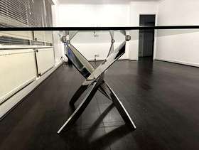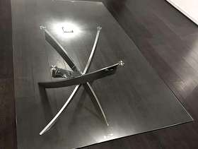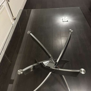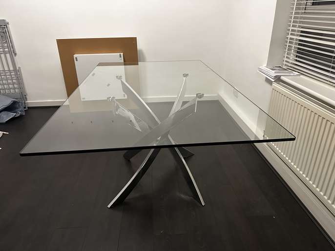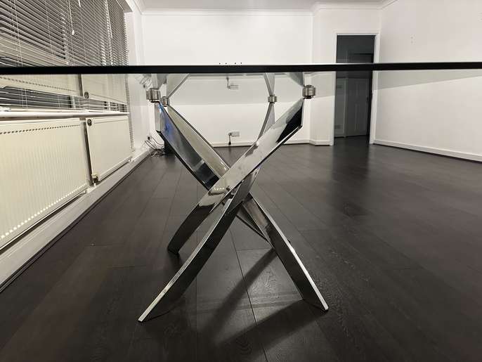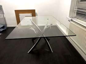 Approx 160cm by 90cm. Glass. Metal legs. Used but in very good condition, a few small faint scratches.