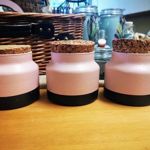 3 x Glass pink and black medium lightweight jars with cork lids. Perfect for storing dry foods or coffee/tea/sugar! They're very light too. Collection from Liss. Price is for all 3 jars.