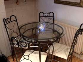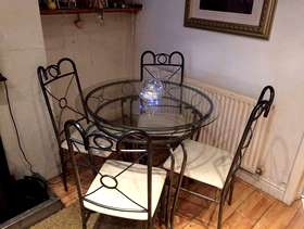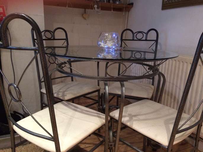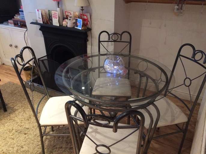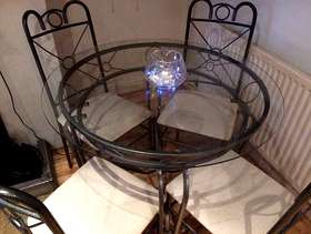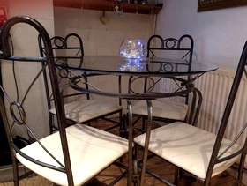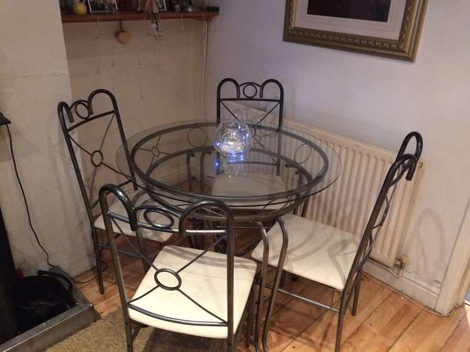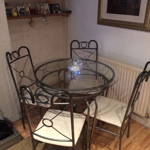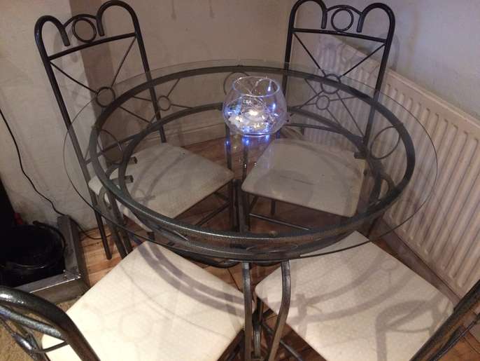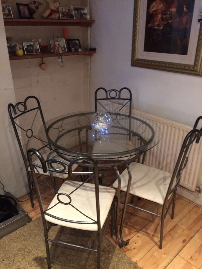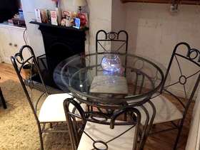 Round Glass table with metal legs with 4 metal chairs and white / cream seat cushions good condition. 36” diameter