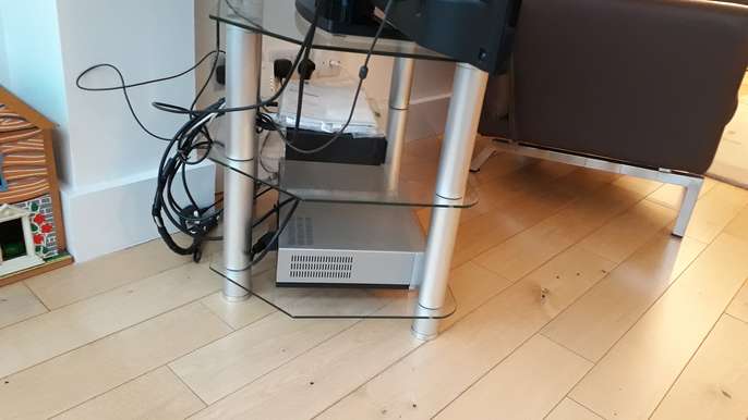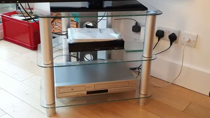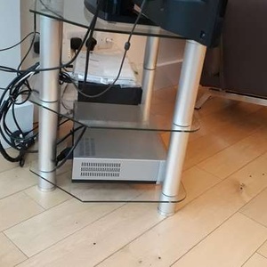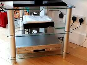 Glass TV stand, currently used to support a 50 inch TV. Height 52cm, Width 60cm, depth 45cm Excellent condition Collection only