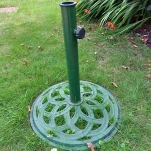 Green cast iron effect base for umbrella to protect from sun.