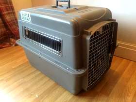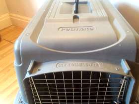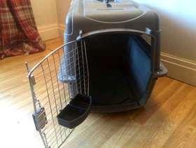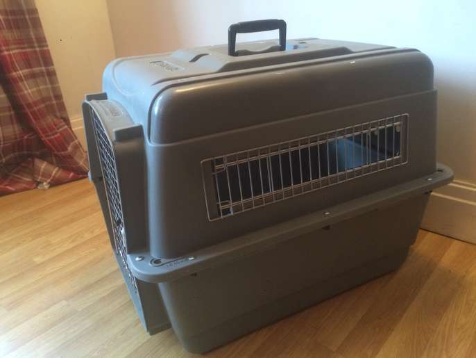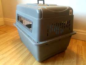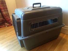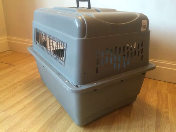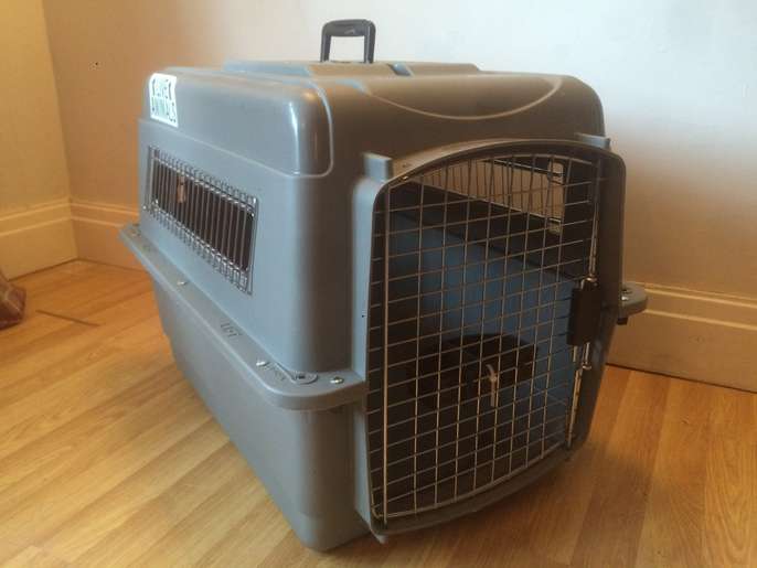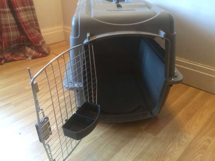 This strong grey pet crate is suitable for animals weighing 25 lbs to 30 lbs it comes with a water tray attached to the metal front opening door it is 70 cm long by 52 cm wide and high I can deliver to the local Halifax/Bradford area for a £10 delivery charge