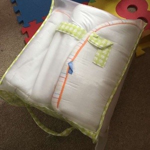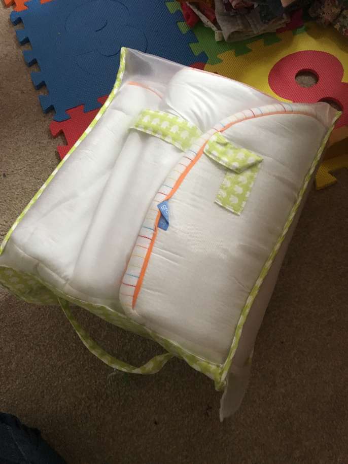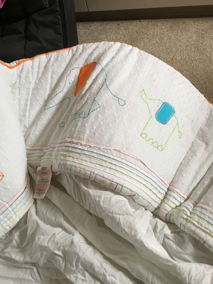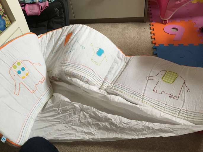Never used as my little one couldn’t get on with it. Bumper features elephants in green and orange. Comes in a bag to protect the cot bumper.