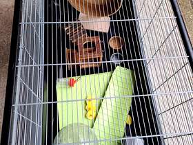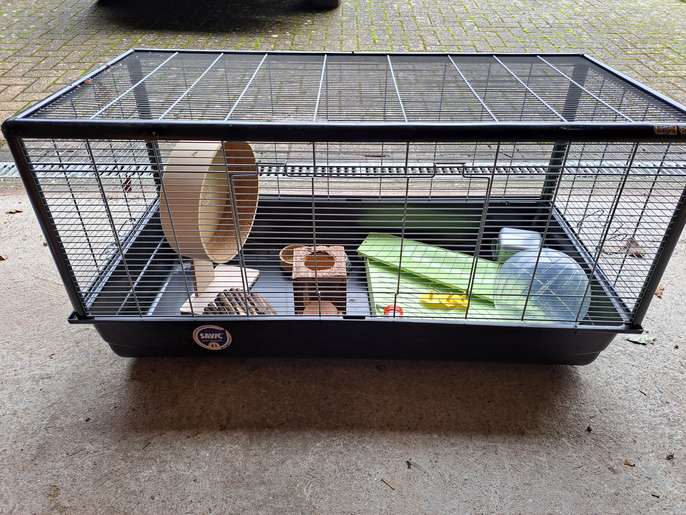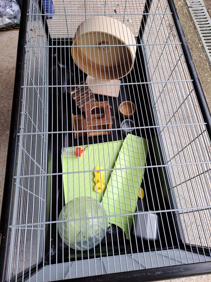 Large hamster cage, suitable for Syrian hamster. 38"L x 19"W x 21"H. Complete with ramp to 2nd level, wooden house, large wooden 'silent' wheel, water bottle etc. Also clear view exercise ball.