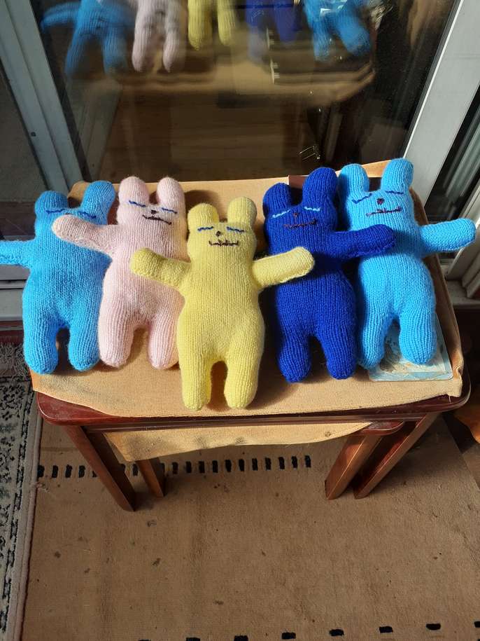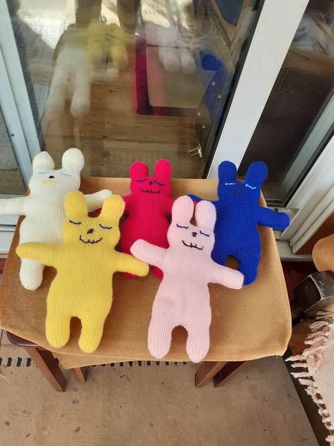 Hand knitted bunnies, lots of colours, ideal for children and babies as all knitted, buyers collect and pay on collection, for details please call nick on 07944688114