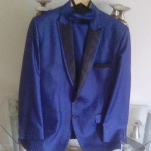 Colour navy /blueish with a sheen. black lapels size trousers approx 34. r jacket 42/44r bow tie also. unused . made in goa location 3 minutes from heathrow... collect today...go to church tommorow in style.????