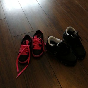 2 pairs of heelies. 1 pair pink and black size 12. 1 pair black and white size 4. Never been worn.