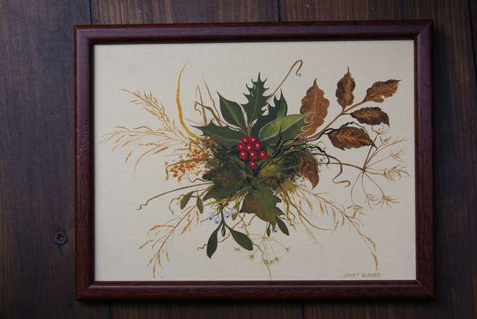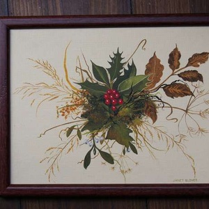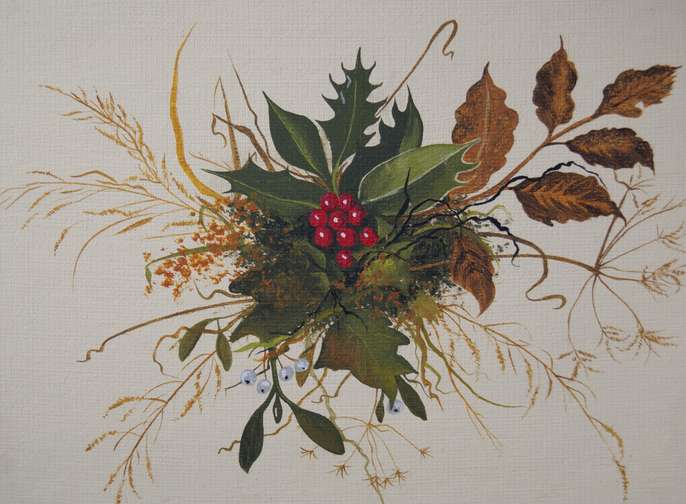 Small framed original painting of winter leaves with holly & ivy, size 21 x 16 cms, 8 x 6 ins