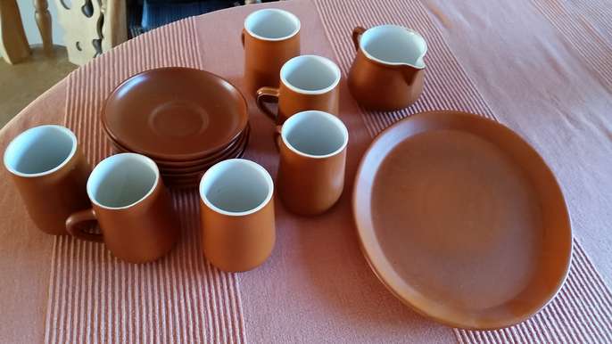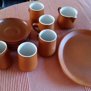 Honiton Pottery Coffee Set, comprising of six cups, saucers, milk jug and plate on brown earthenware.