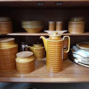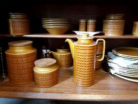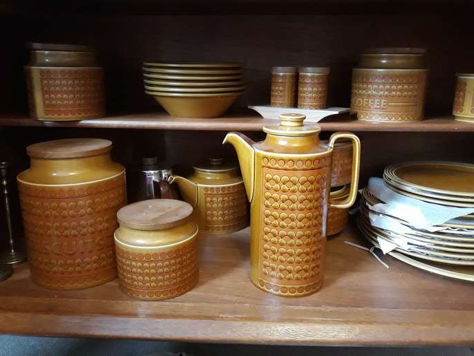 A complete dinner set . 6 x pudding bowls 1 x cream jug 1 x jam pot 5 mugs 4 soup bowls 1 salt and pepper pot 5 side plates 1 platter 1 coffee pot 3 canisters 1 biscuit barrel 1 tea pot 2 casseroles 7 dinner plates 6 plates