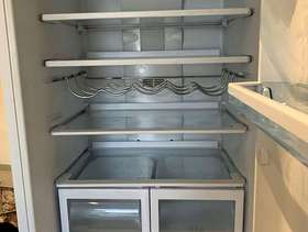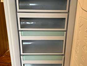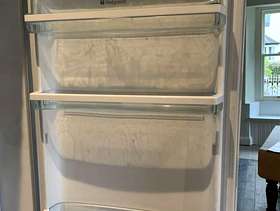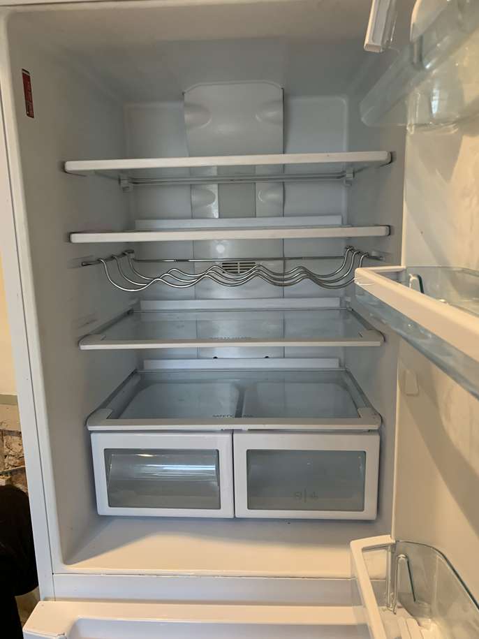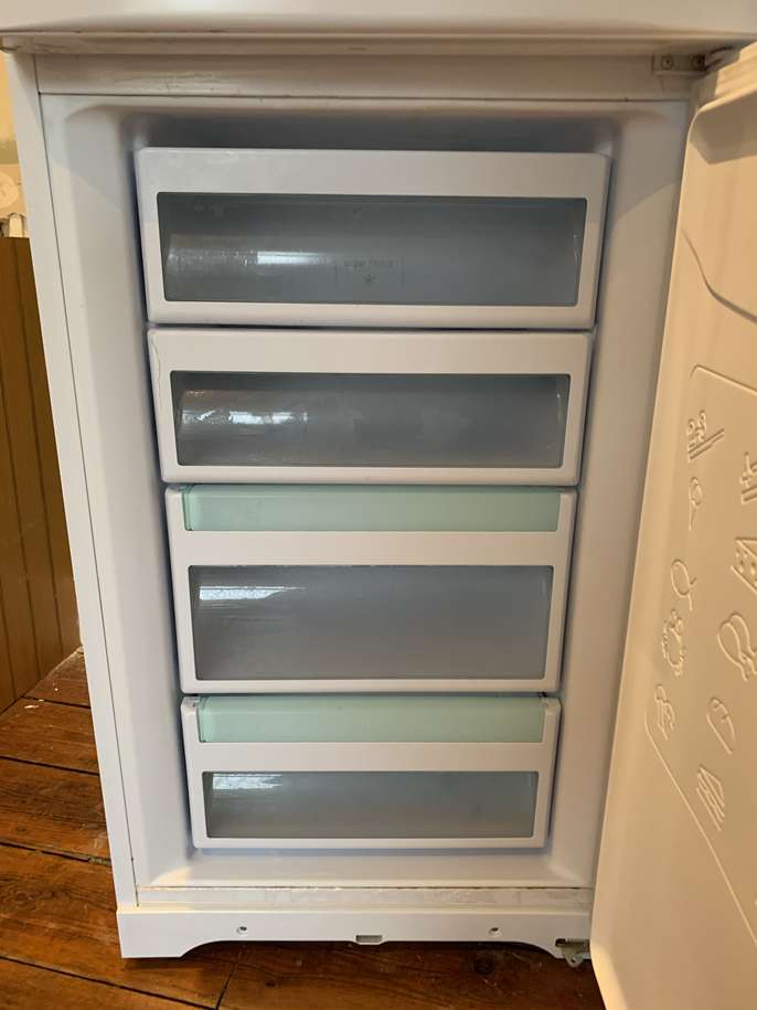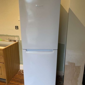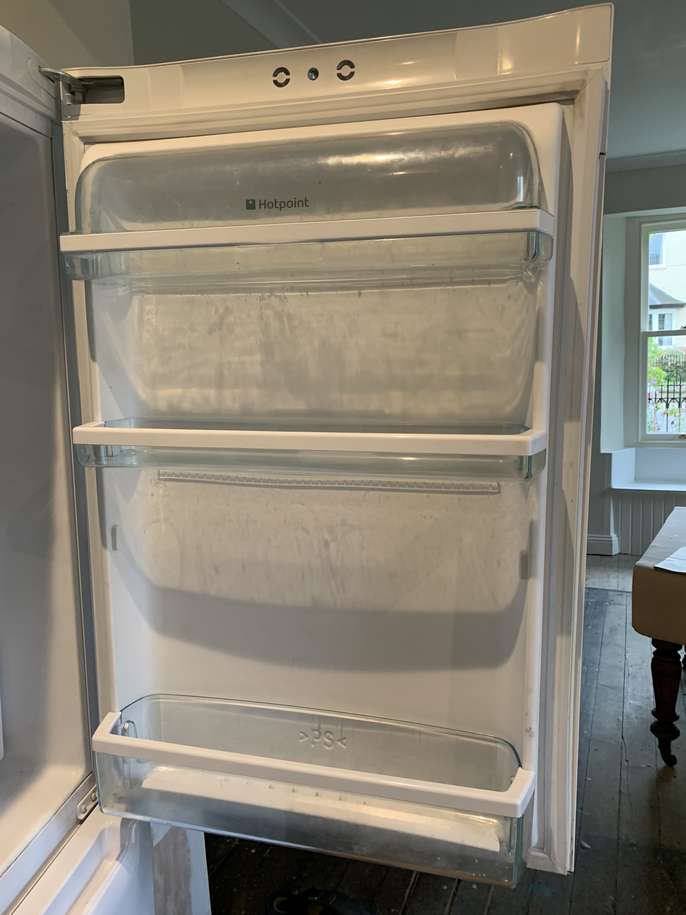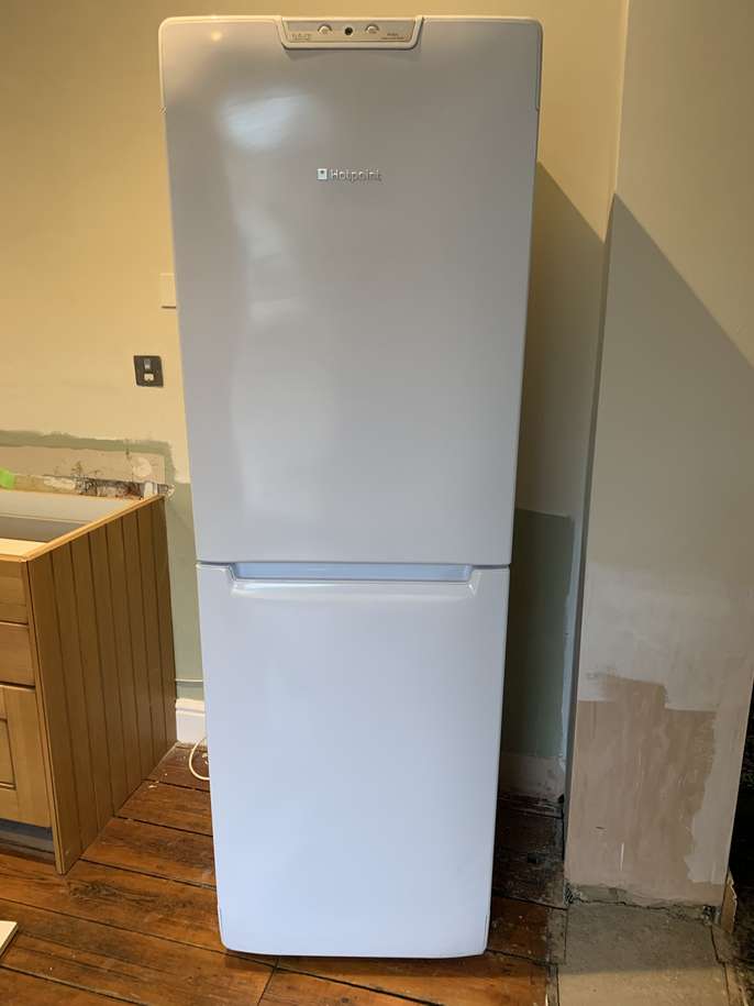 Hotpoint fridge freezer. Standard size, working well. There are a couple of small cracks on the fronts of one freezer and one fridge drawer, but it does not affect the function at all