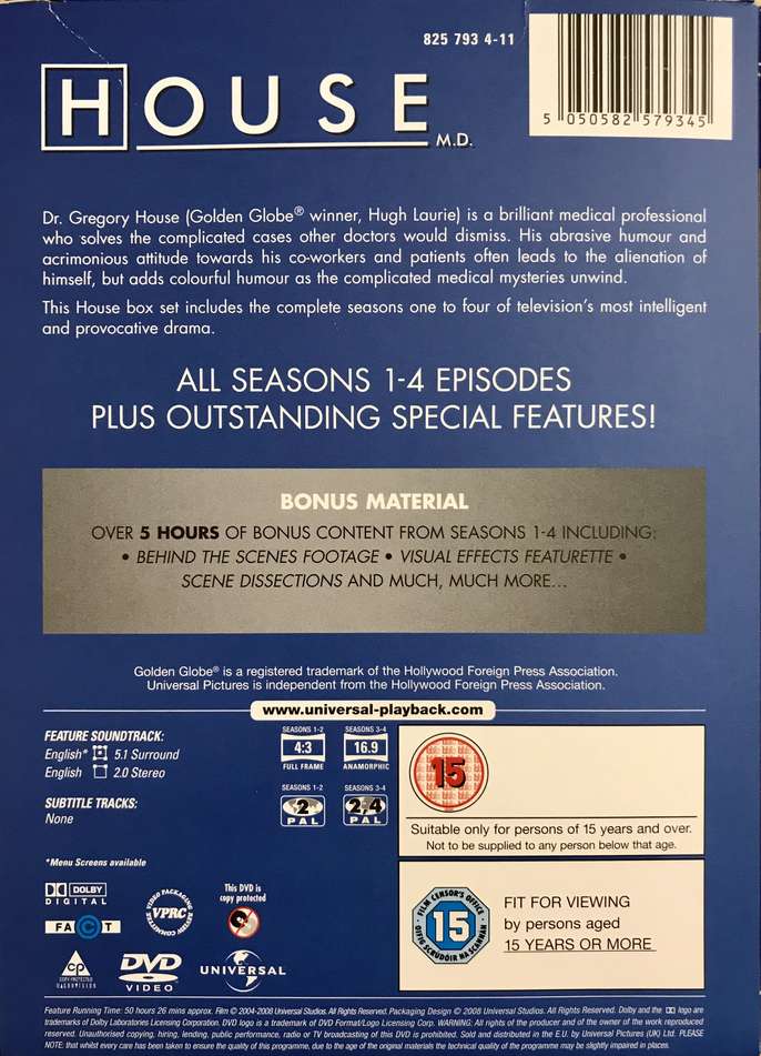 This is the boxed set of the first four seasons of the award winning House, featuring Gregory House (Hugh Laurie). There are 22 discs in total and condition is excellent - as new.
