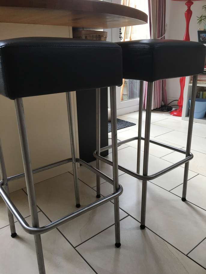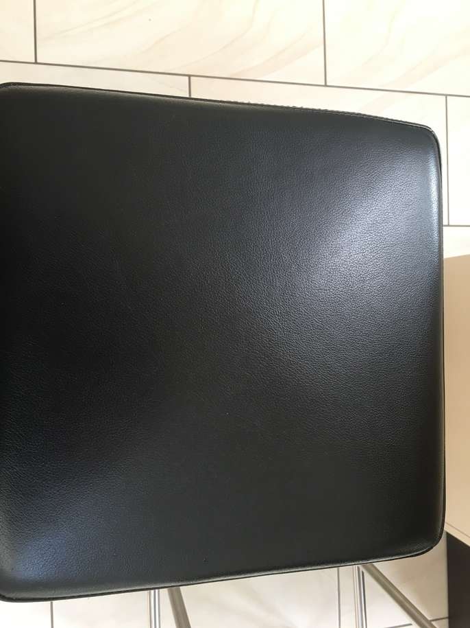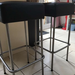 Bar stool with black leather seat and aluminium legs. Excellent condition - ready for immediate collection. Dimensions 72.5 cm x 35 cm x 35 cm