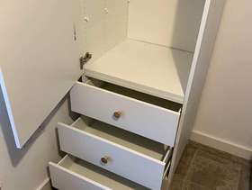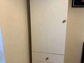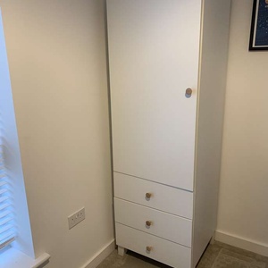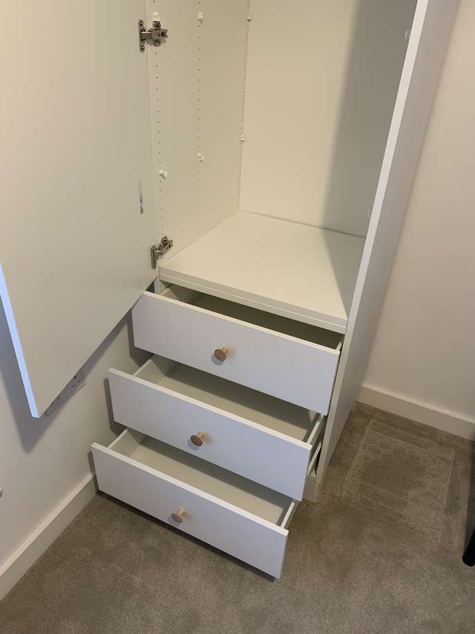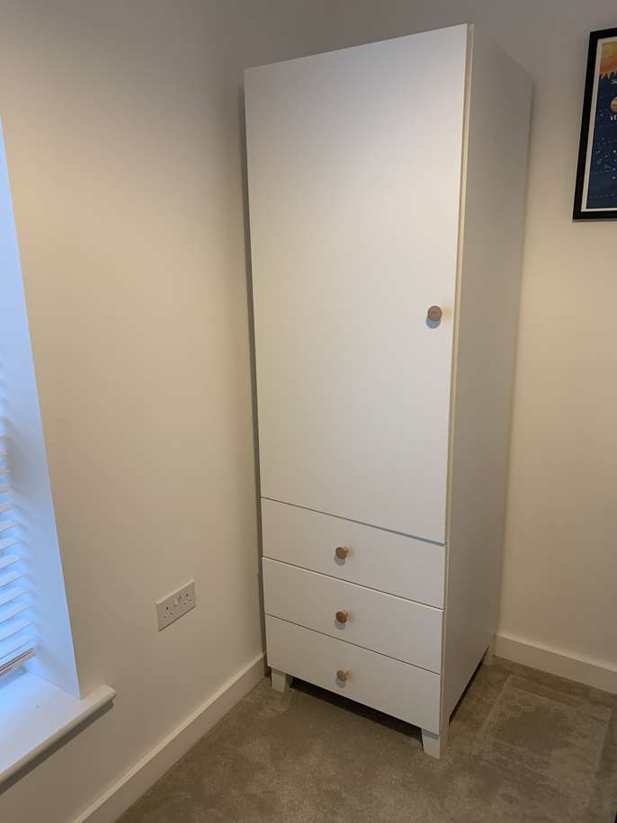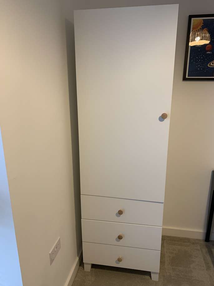 IKEA Platsa wardrobe with three drawers, legs and spare shelves. 60cm Wide, 55cm deep, 180cm high It’s almost new. We’re turning our spare bedroom into an office so we don’t need it. There are a couple of shelves if you want to use it as a storage cupboard.
