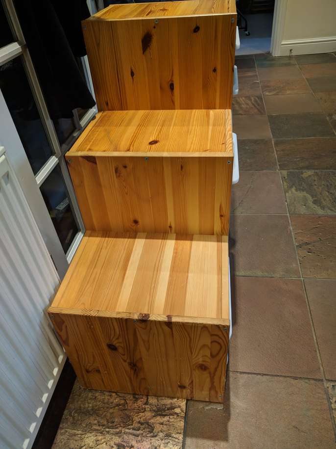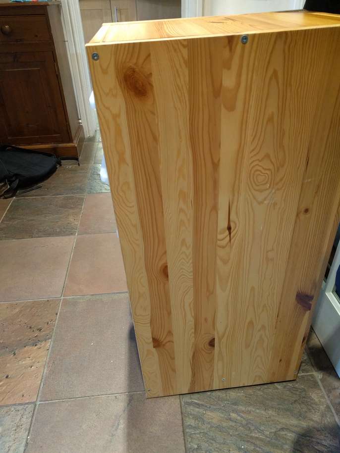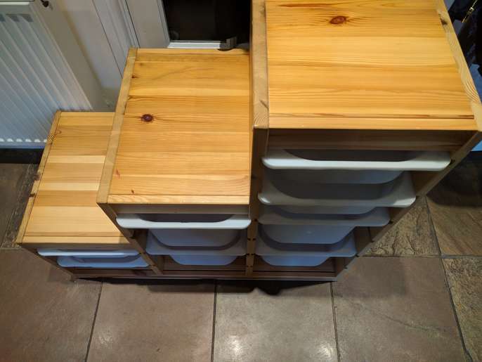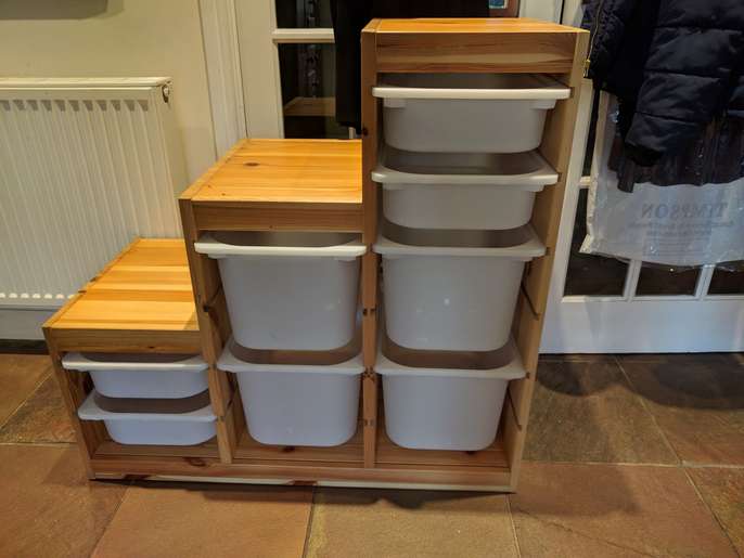 Ikea wooden Trofast storage unit - has usual dinks and dents associated with pine - but loads of life left in it .