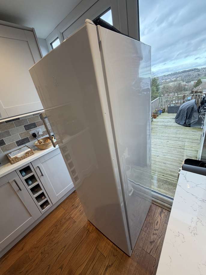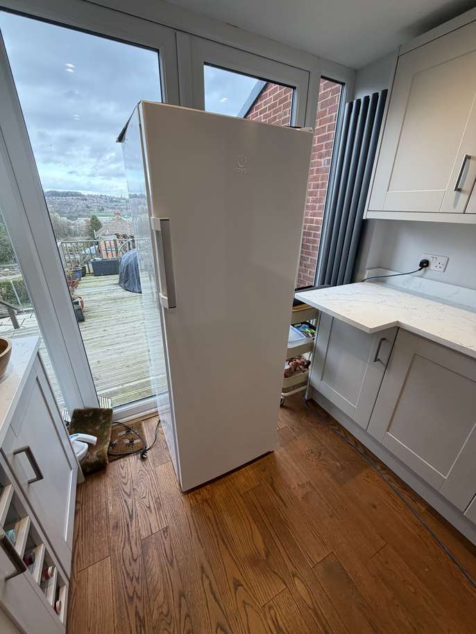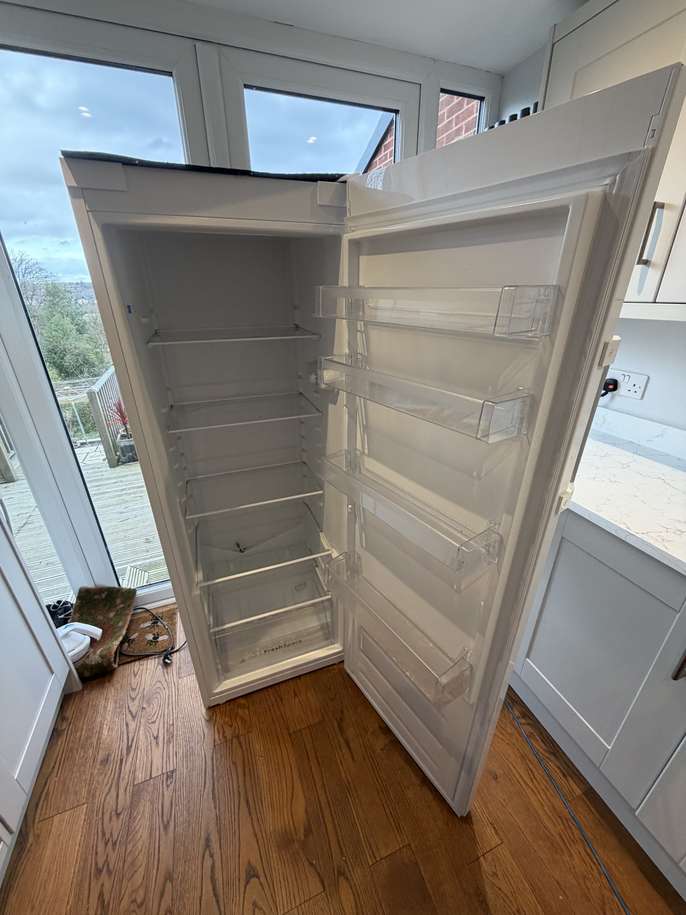 This is an Indesit S16 1W1 - freestanding fridge ( fridge only - not fridge-freezer) with a very generous capacity of 323 litres. It is in perfect condition with no scratches or blemishes on the exterior. The fridge works perfectly and is only about two years old. Selling due to kitchen remodelling which includes a built-in fridge. Buyer will need to collect. Height = 167cm Depth = 64.5cm Width = 59.5cm