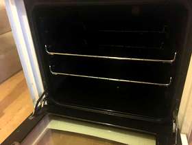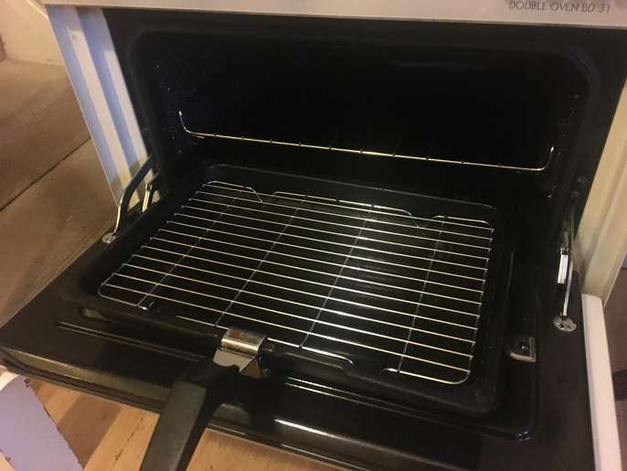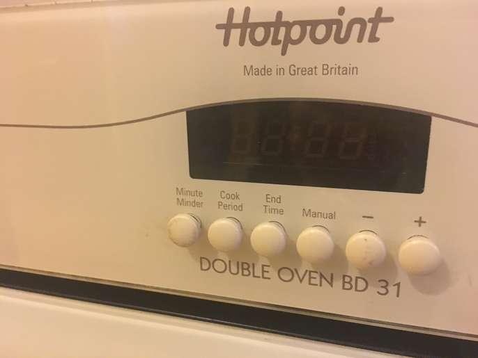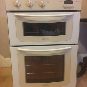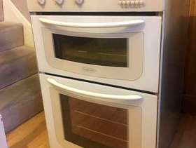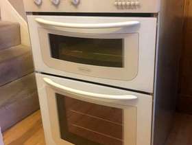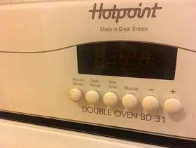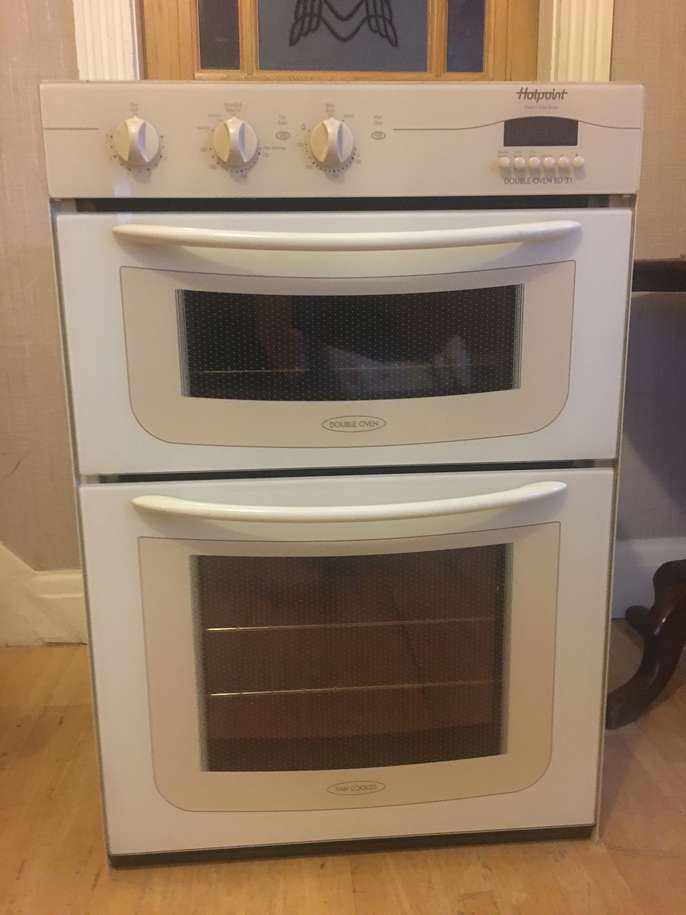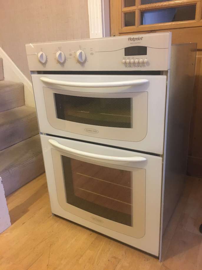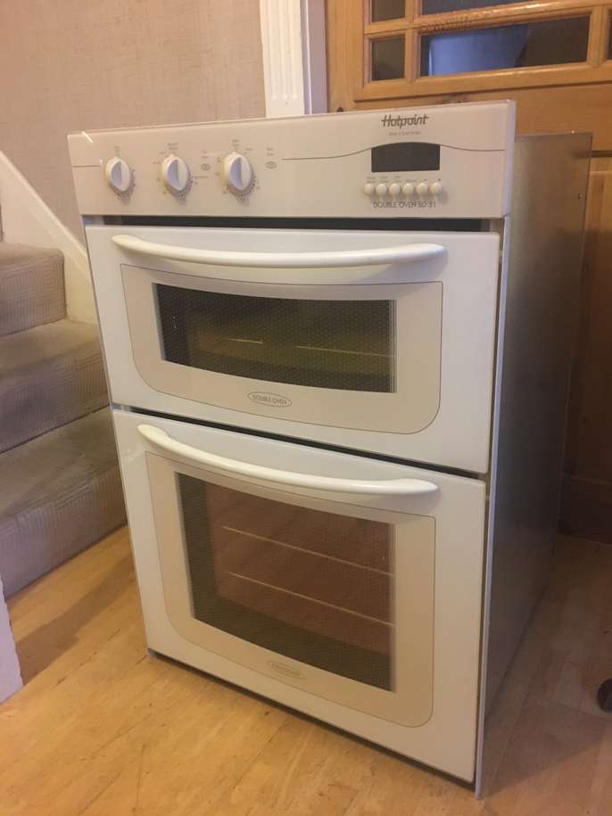 This hotpoint double oven model number bd31 is very clean from a smoke-free home the glass sparkles and inside the oven is not all greasy and dirty it has a dual grill a large lower oven and a smaller top oven with clock and timer function it is an integrated oven and will need wiring in the oven needs a space of 87 cm high 56 cm long and 54 cm deep to fit into i also have the matching gas hob available i can deliver to the local halifax/bradford area for a £10 delivery charge