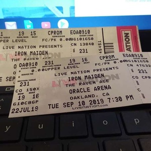 Two tickets for Iron Maiden on Tue, Sept. 10 at 7:30. Seats are section 231 - row 19 - seats 15,16.