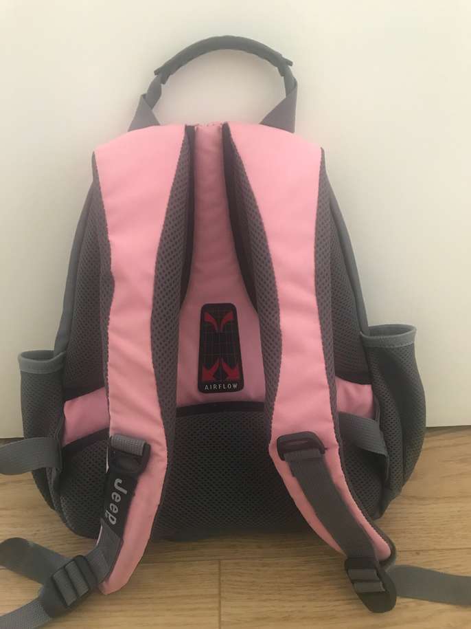 Jeep Airflow backpack, pale pink & grey, mesh side pockets for drinks & water bottles, two zipped compartments, padded back for comfort, good condition