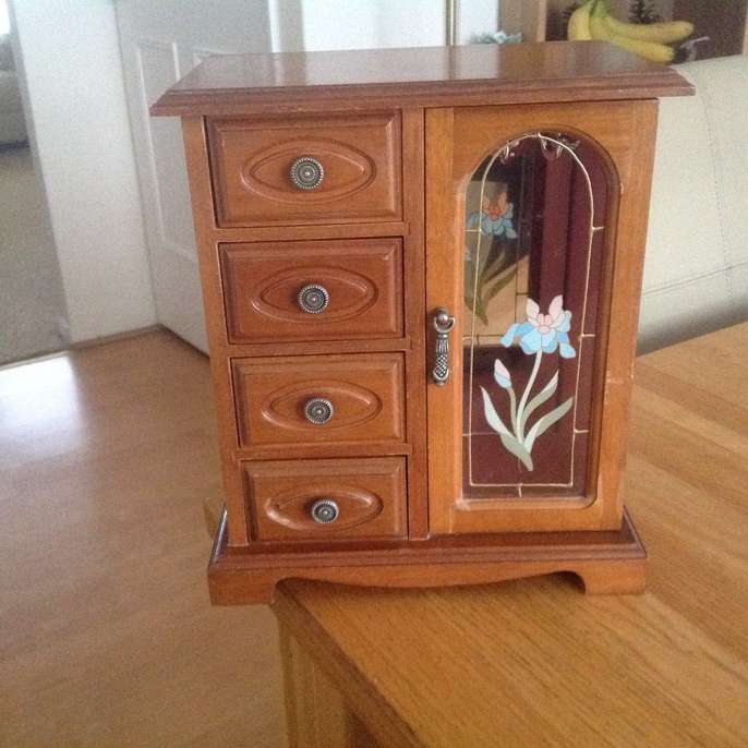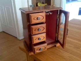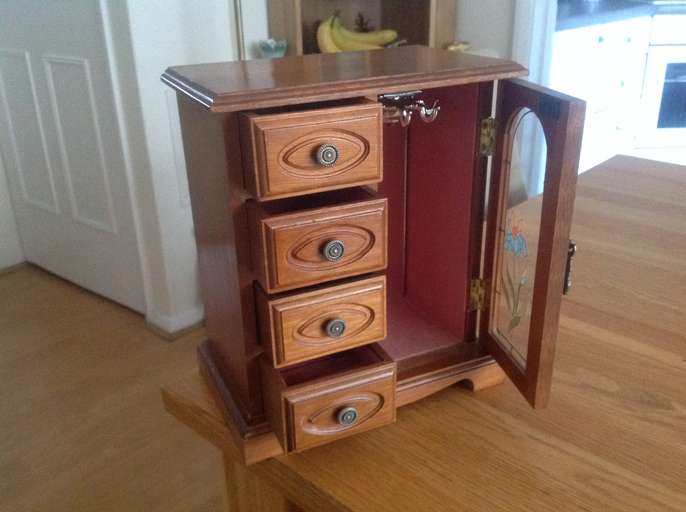 Jewellery Box in good condition Complete with four drawers and hanging space for necklaces Size approximately 8 inches wide and 9.5 inches high Selling for just £5