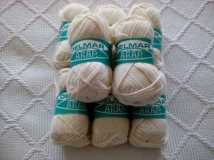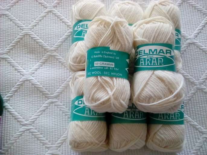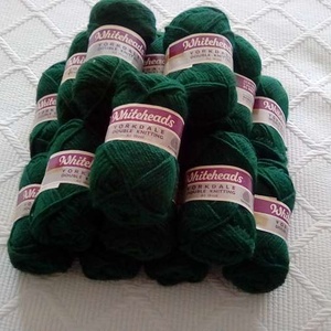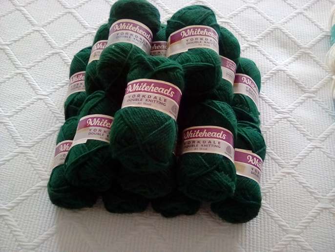 17x1oz balls of pure new wool, bottle green colour. 8x 50gr8 balls of 50% wool 50% nylon off white colour