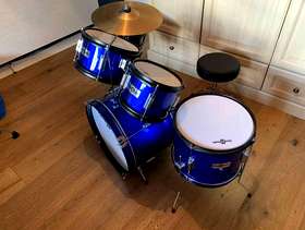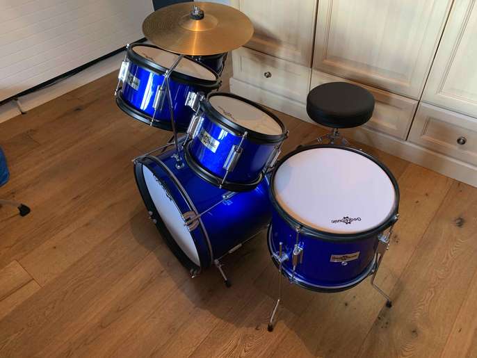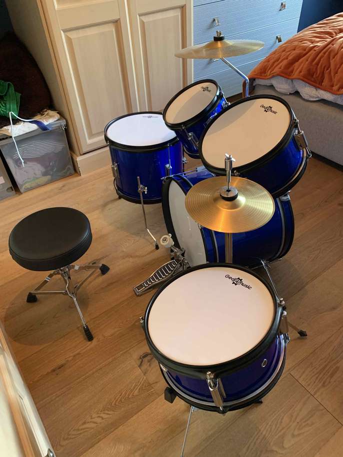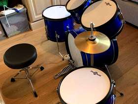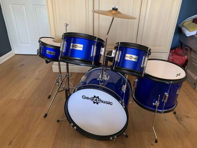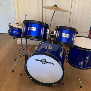 Junior 5 Piece Drum Kit by Gear4Music - Blue. Collection in person only. Bought new, 2 and a half years ago, selling due to upgrade. Ideal starter drum kit for 5 to 10 year olds. General wear and tear, odd loose screw, kit in good condition; drum sticks included (not in picture) as well as small stool.